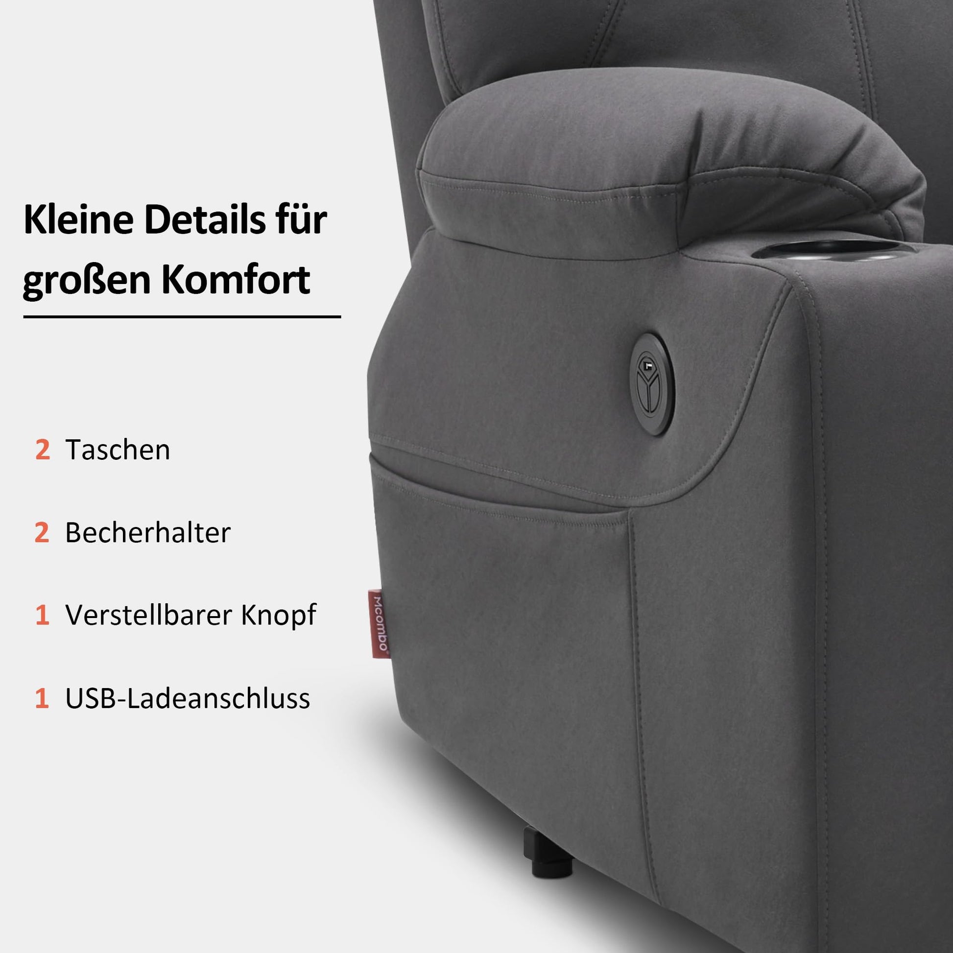 M MCombo Elektrischer Fernsehsessel mit Aufstehhilfe, Wärme- & Massagefunktion, Liege bis 140°, USB, Knopfsteuerung, Mikrofaser Grau.