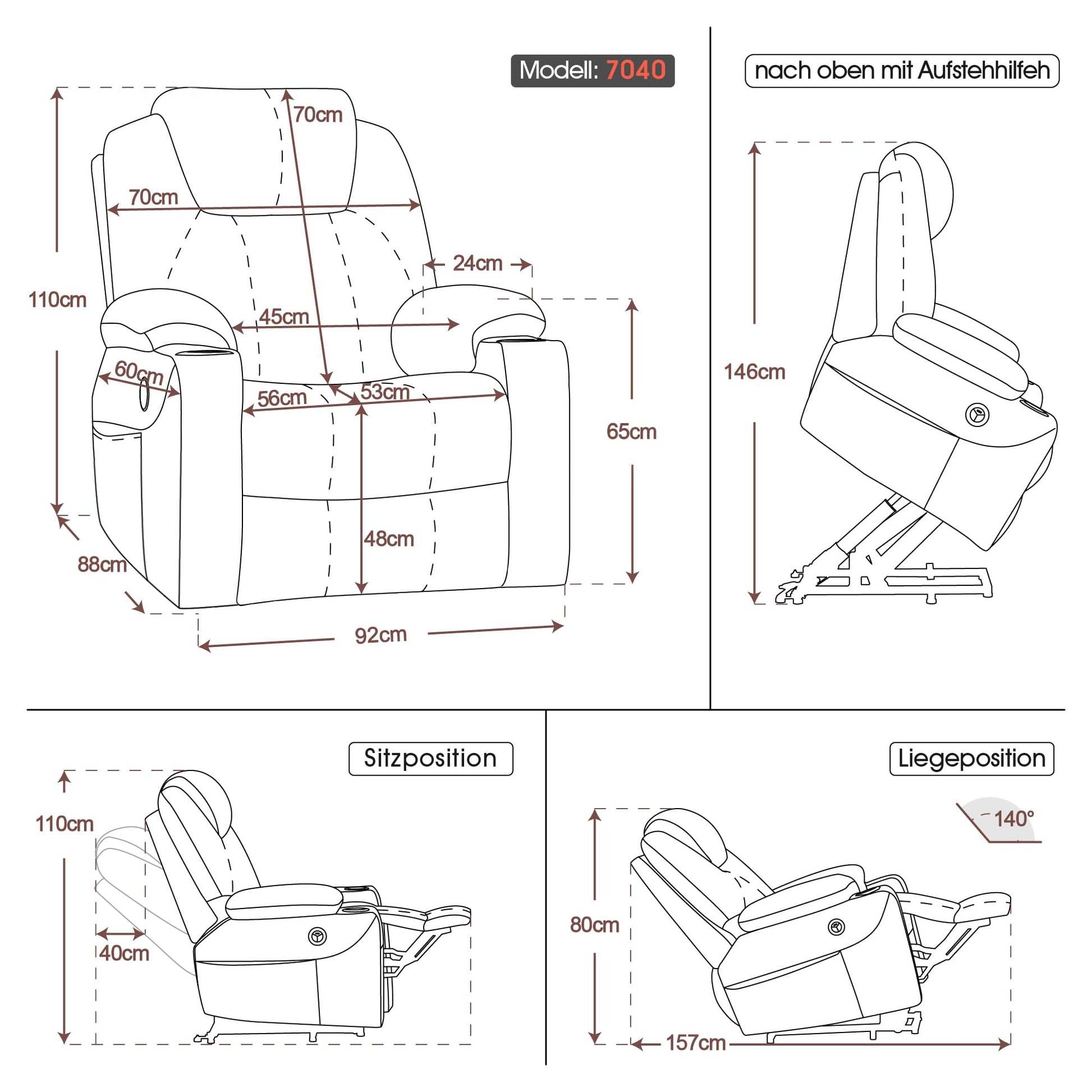 - Aufstehhilfe & Liegefunktion:Mit 1 effizienten Motor kann der Relaxsessel sehr sanft zum Aufstehen angehoben werden; zudem lässt sich die Rückenlehne des Fernsehsessels stufenlos bis zu 140° neigen