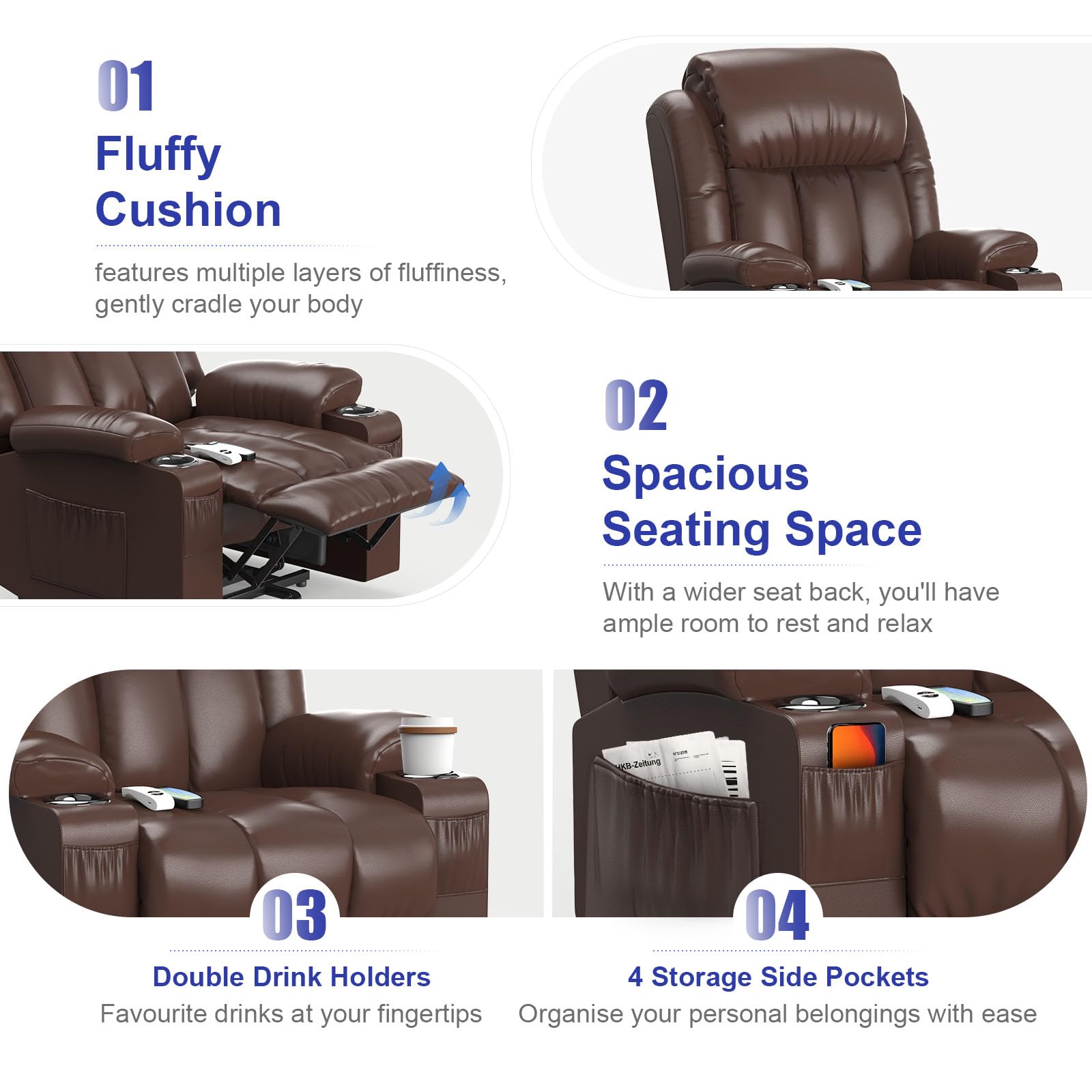 - Reichlich Aufbewahrungsmöglichkeiten: Bewahren Sie Ihre Lieblingssnacks und -getränke mit den vier Aufbewahrungstaschen und zwei Getränkehaltern griffbereit auf. Außerdem die Fernbedienung mit USB- und Typ-C-Anschlüssen sorgt dafür, dass Ihr Telefon und andere Geräte immer voll aufgeladen sind
